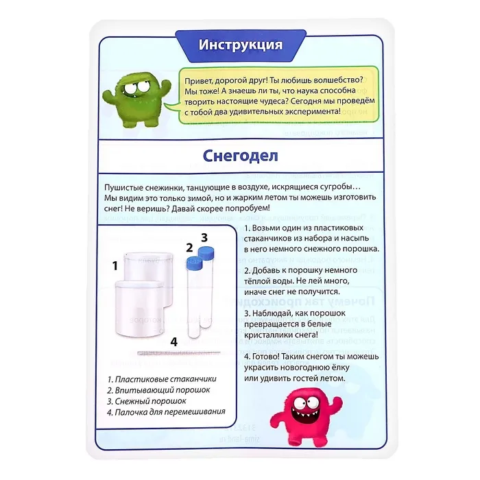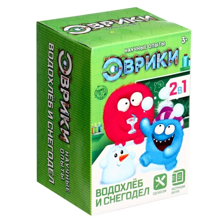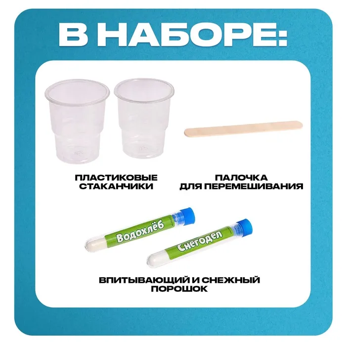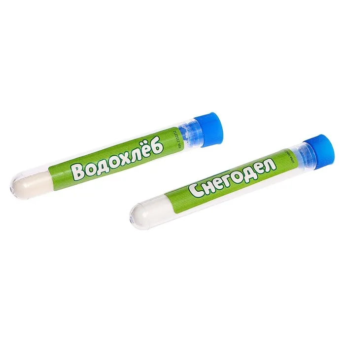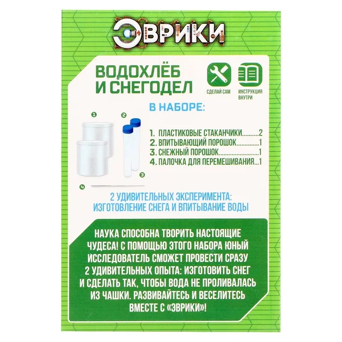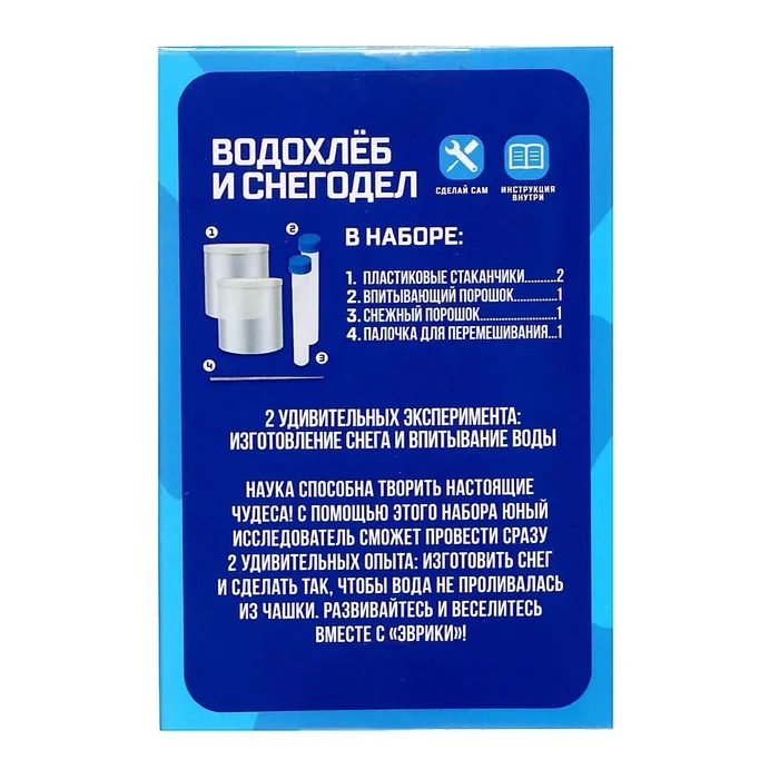 Набор для опытов «Водохлёб и снег» от торговой марки «Эврики» — это увлекательный комплект для юных исследователей, позволяющий провести два занимательных эксперимента: создание искусственного снега и демонстрацию «невыплескивающейся» воды.