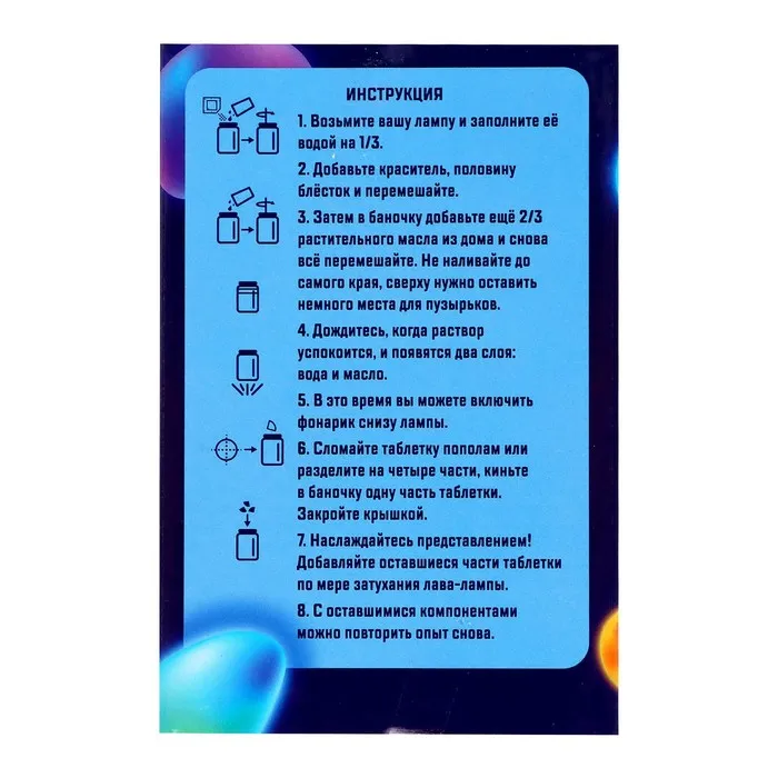 Игра и обучение: Этот набор – не просто эксперимент, а инструмент для развития. Он помогает понять основы химических процессов через увлекательный опыт. Набор рекомендован детям старше 5 лет и станет отличным подарком для юных исследователей. Подарите ребенку возможность открывать науку через игру – пусть он создает свою первую волшебную лава-лампу!