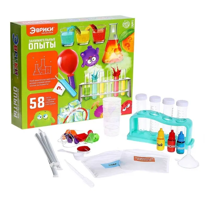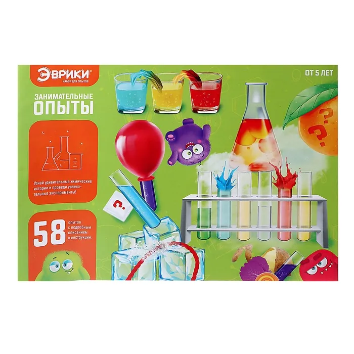 С этим познавательным набором для опытов ребёнок почувствует себя настоящим учёным. Малыш узнает об удивительных химических свойствах и проведёт 58 увлекательных экспериментов.