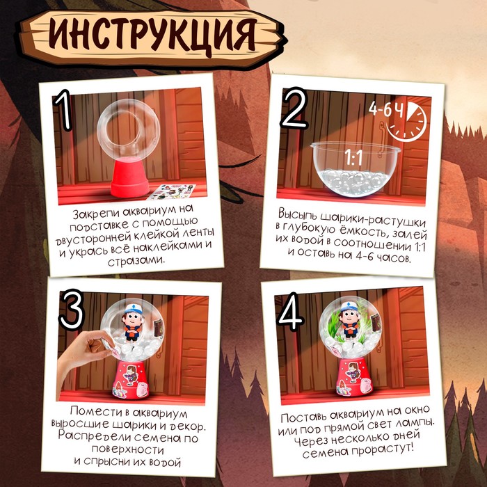 Набор для опытов «Живой аквариум» Гравити Фолз станет прекрасным способом занять детей и показать им процесс прорастания семян. Ребёнок самостоятельно проведёт эксперимент с шариками-растушками, вырастит декоративную травку в домашних условиях, и научится ухаживать за растением.