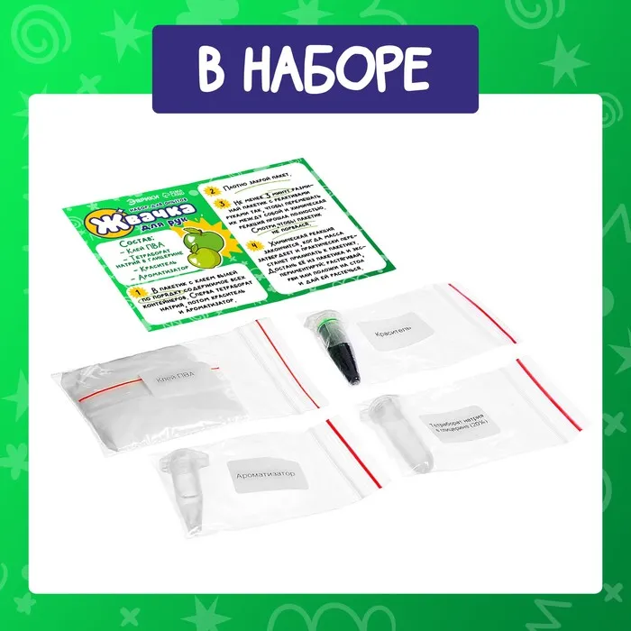 Набор для опытов «Жвачка для рук» позволит ребёнку провести увлекательный эксперимент по химии и создать ароматизированный слайм своими руками.