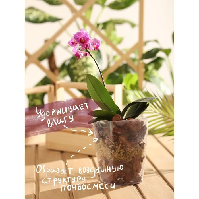 Кора сосновая - добавка для составления субстратов. Применяется в качестве добавки при составлении субстрата, для хранения саженцев и корневищ многолетних растений, мульчирования почвы, укоренения черенков, изготовления опор, висячих корзинок, сухих букетов и композиций.