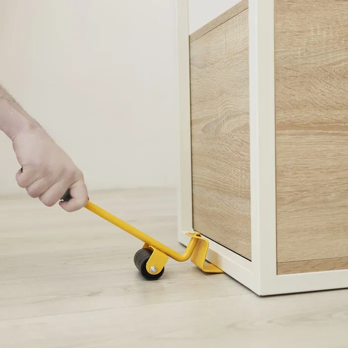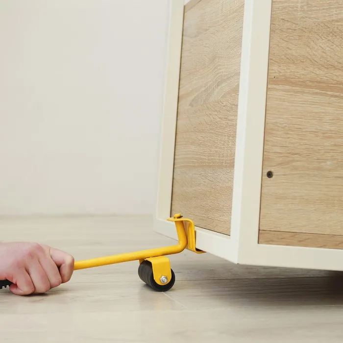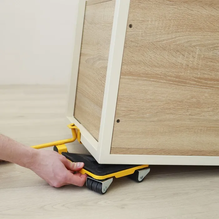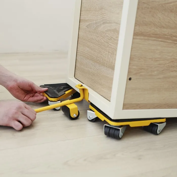 Принцип работы: мебель необходимо поднять с помощью рычага-домкрата и поочерёдно подложить под каждый угол транспортную платформу.