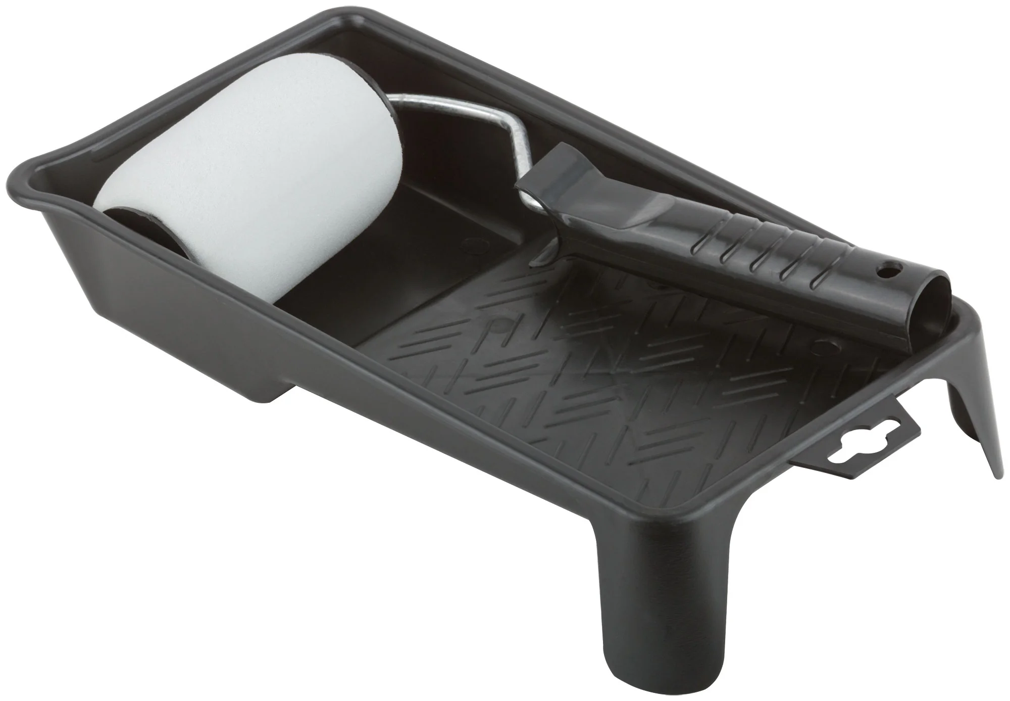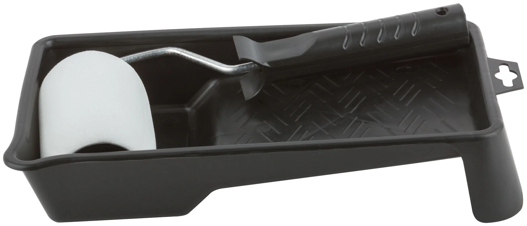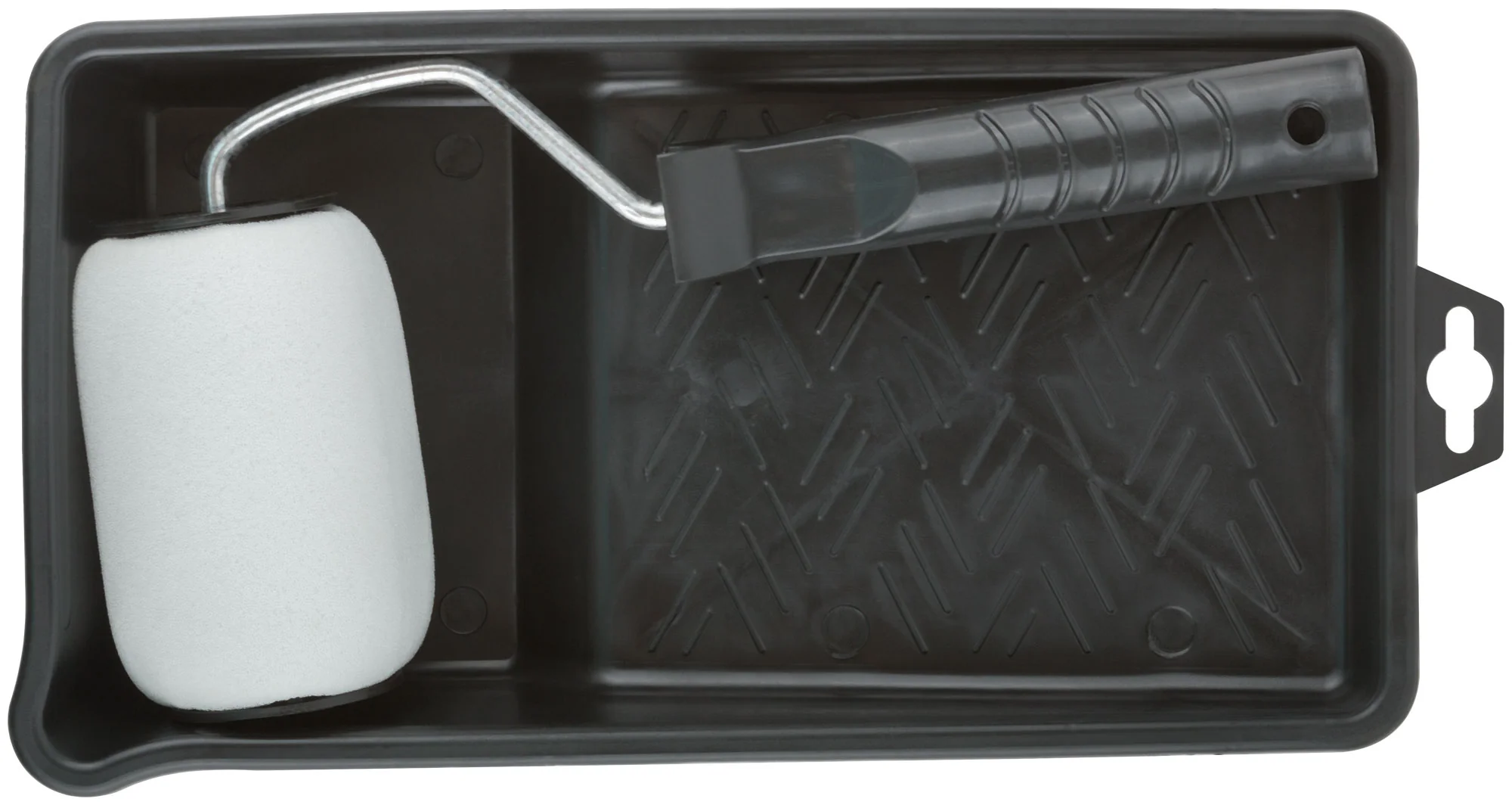В комплект входят пластиковая ванночка размером 290х150 мм и поролоновый валик длиной 100 мм. Поролон высокой плотности в сочетании с системой пластикового ролика обеспечивает равномерное нанесение краски.