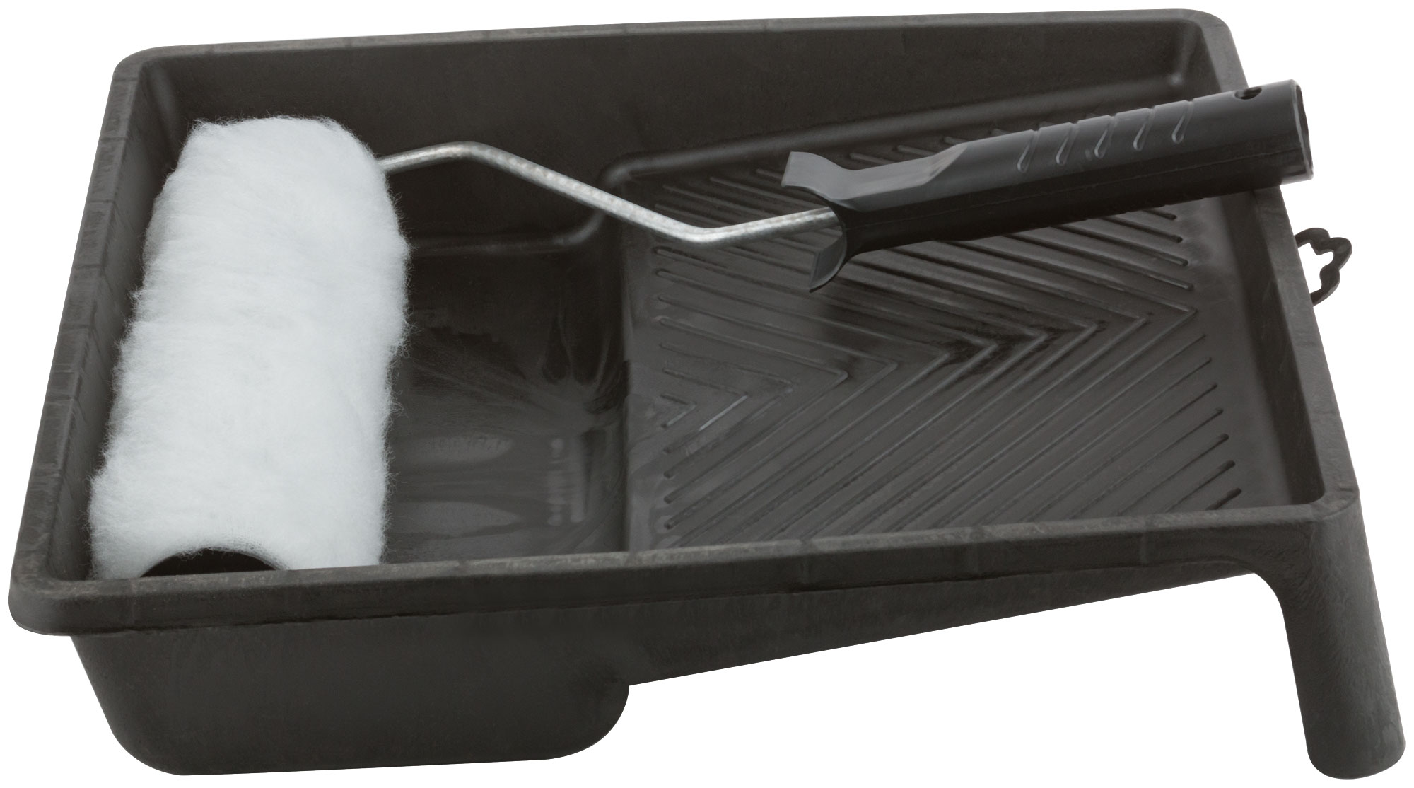 Комплект состоит из пластиковой ванночки размером 350х330 мм и валика с искусственным мехом длиной 250 мм. Валик имеет ворс 10 мм и систему с гайкой, что обеспечивает равномерное нанесение краски на поверхность.