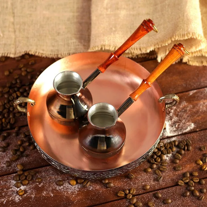 Турки изготовлены из меди, которая обладает равномерной теплопроводностью, что идеально подходит для варки этого напитка. Для предохранения меди от окисления внутреннее покрытие выполнено из пищевого олова. Мелкий кварцевый песок нагревается равномерно и быстро.