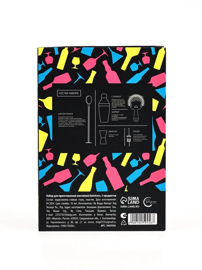 Набор для приготовления коктейлей «Antistress» — идеальный выбор для любителей качественных напитков. В комплект входят 5 предметов: барная ложка, шейкер, стрейнер, джиггер, гейзер.