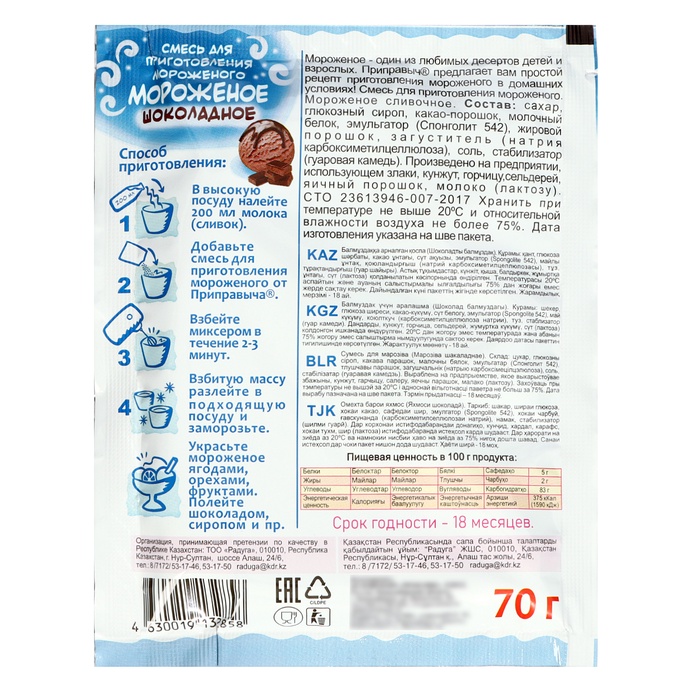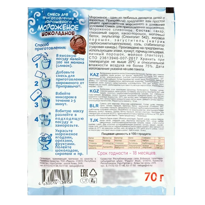 Набор для приготовления мороженого, шоколадный, "Приправыч, 210 г (70*3), — Характеристики
