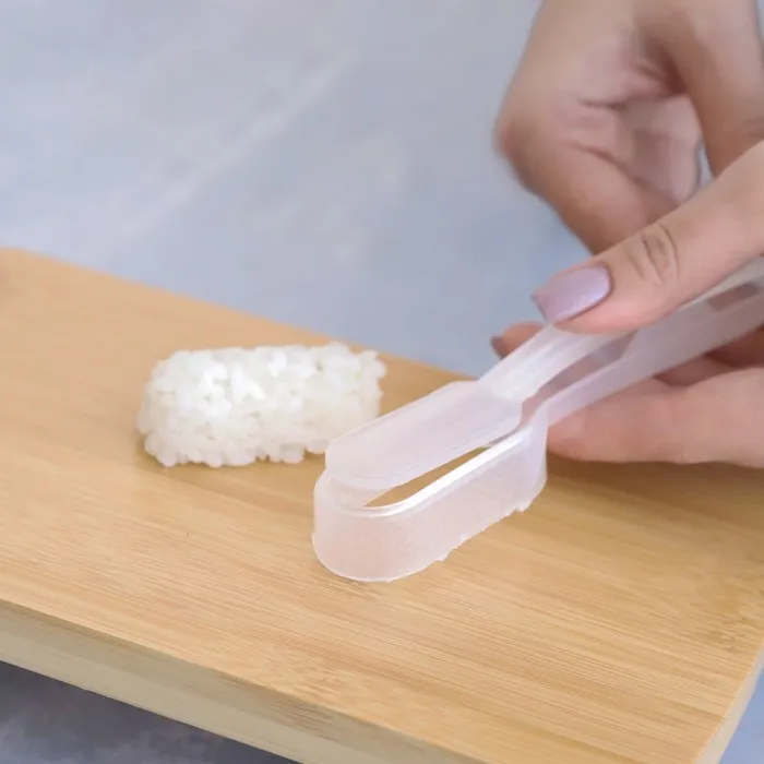 - С помощью специальной вилочки аккуратно раскладываем небольшое количество риса и, используя маленький пресс, делаем в рисе небольшое углубление.
