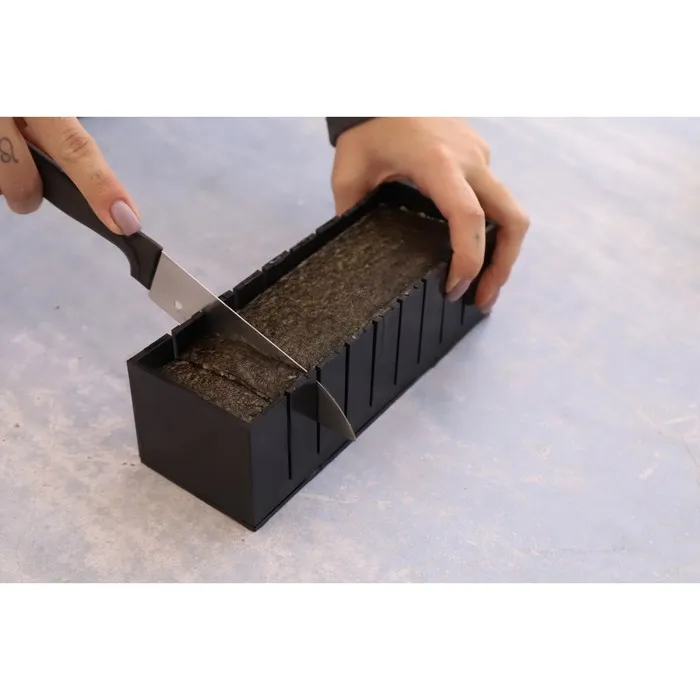- С помощью особого ножа делим получившийся рулет на отдельные роллы (режем вдоль формы, по специальным прорезям).