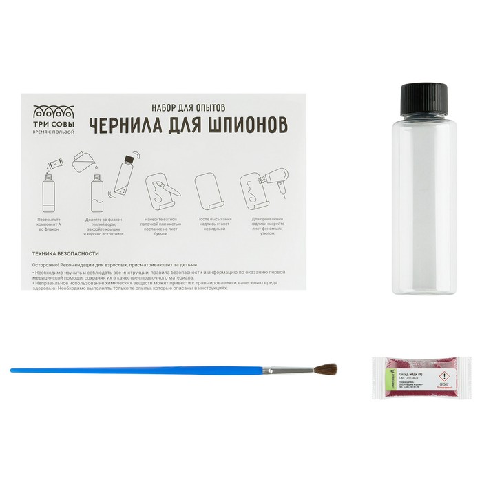 Набор для проведения опытов «Чернила для шпионов» — набор станет настоящим открытием для любознательных детей от 8 лет, позволит им самостоятельно провести первые научные эксперименты дома и узнать множество нового о химических и физических законах.