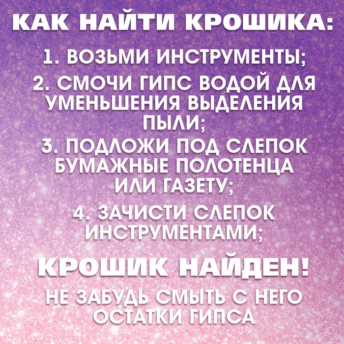 В наборе есть кисточка, долото, гипсовый объект с миниатюрным пупсиком внутри.