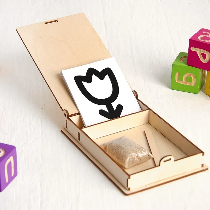 Насыпьте песок в поддон, выберите карточку и поставьте её вертикально. Задача крохи - повторить изображение с карточки на песке. Сначала малыш может делать это пальчиками, а потом палочкой.