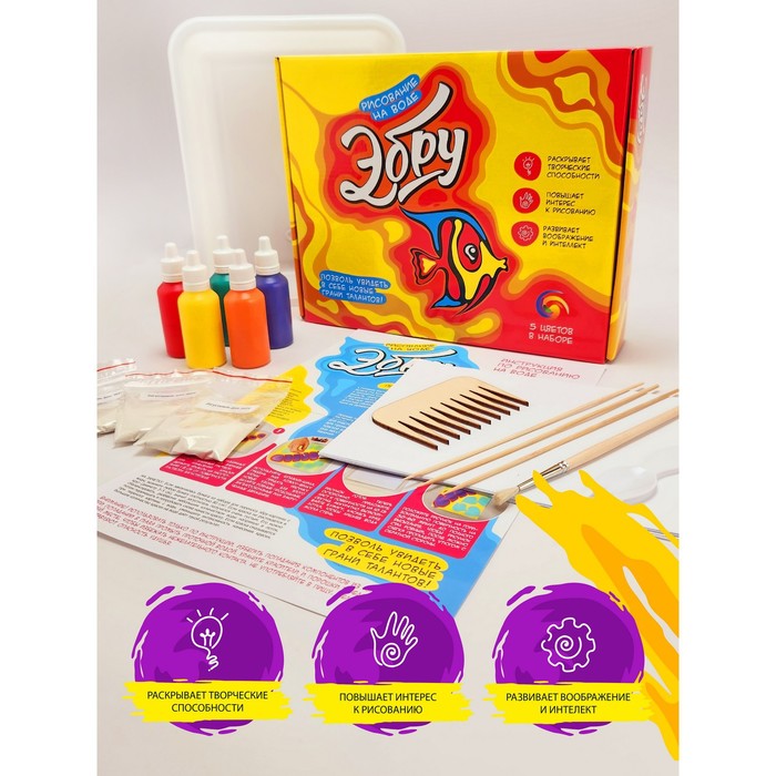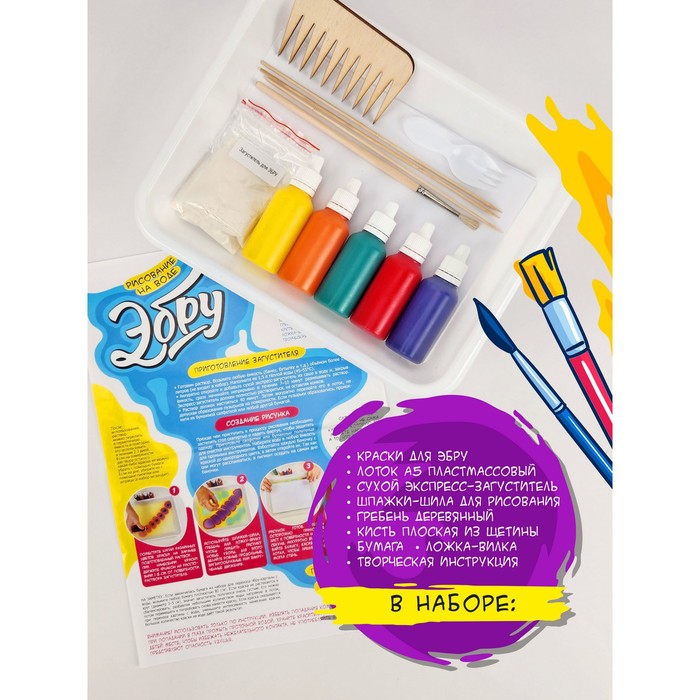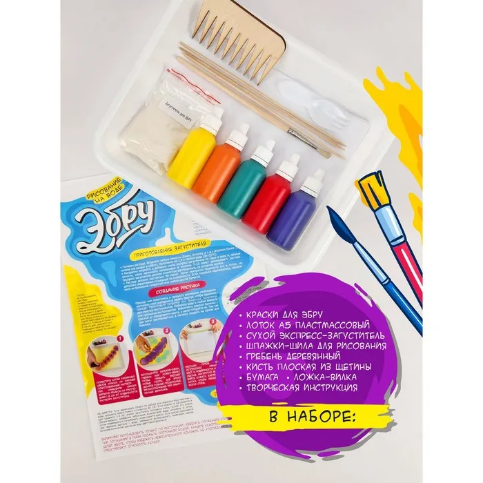 Набор для рисования эбру: краски 6 цв по 6 мл, 10 листов бумаги, загуститель 10 г, инструменты, поддон