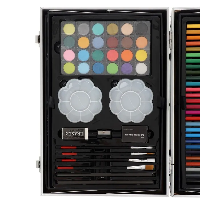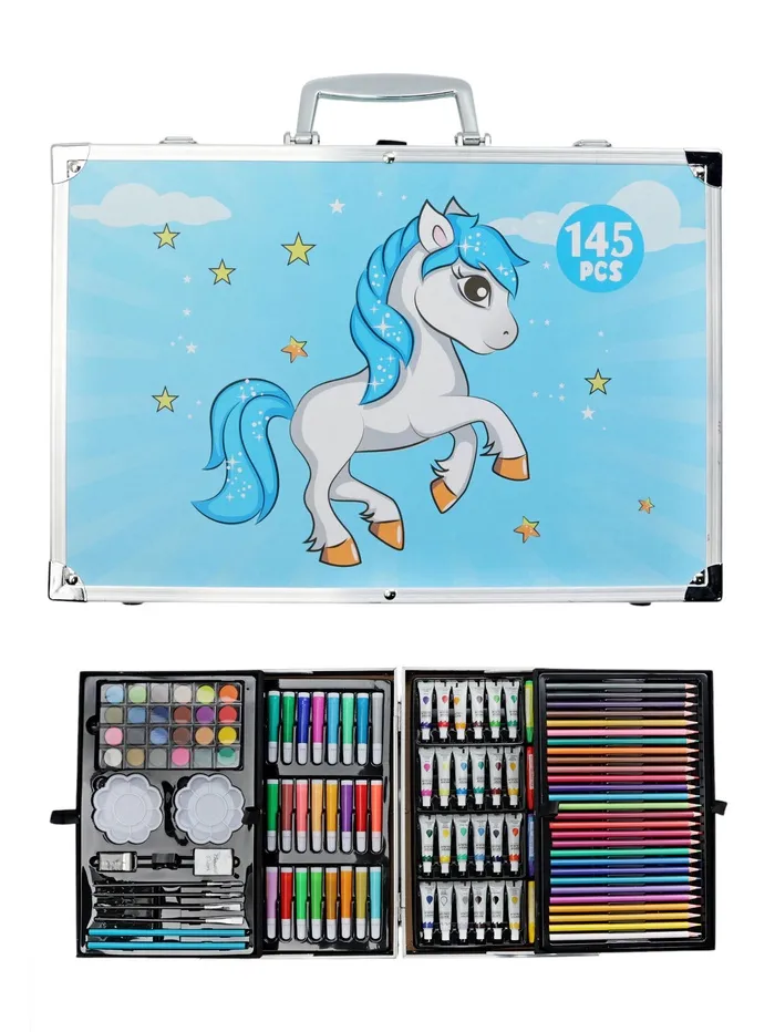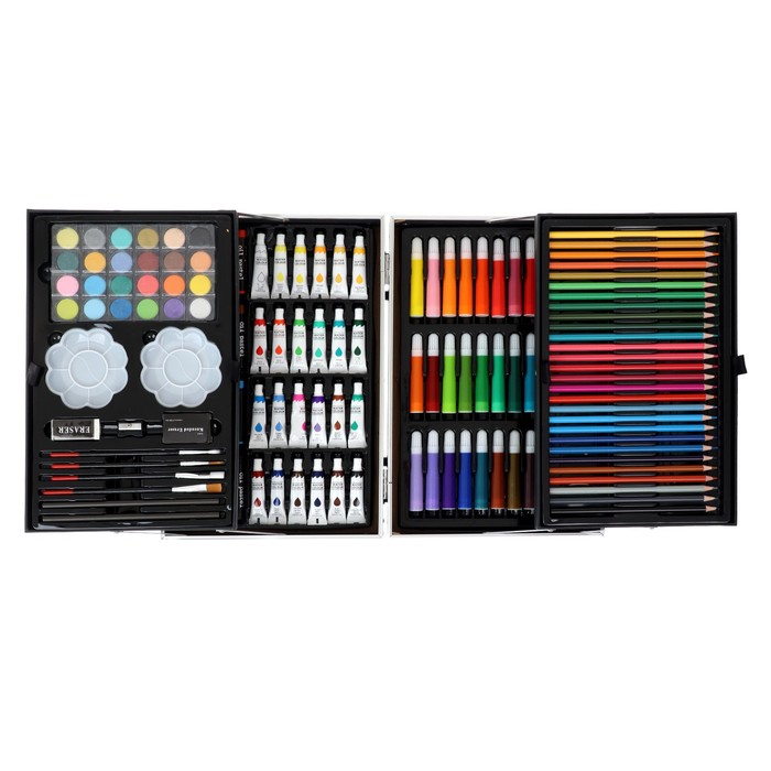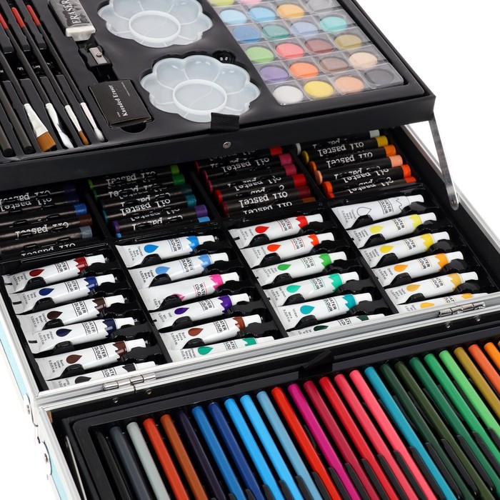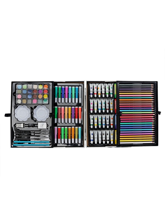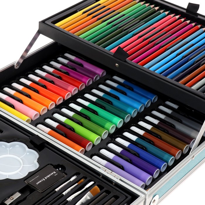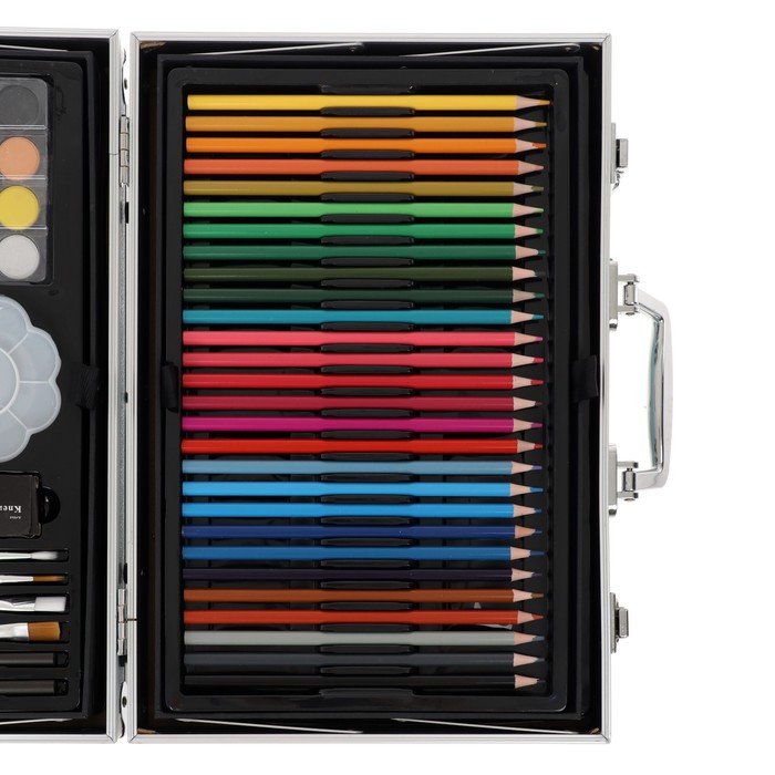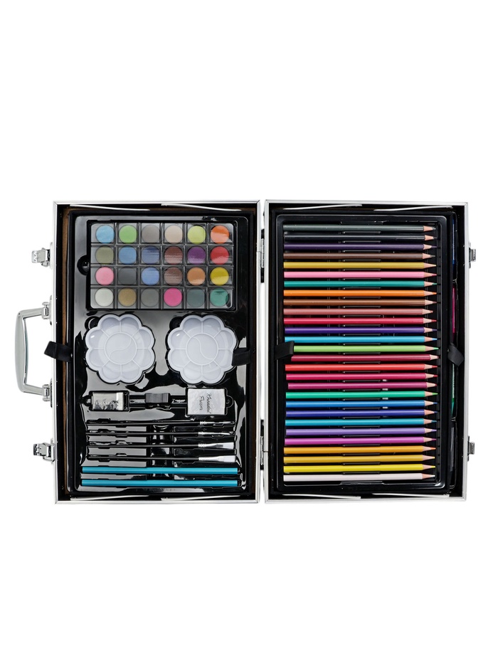 Набор хорошо развивает усидчивость, воображение, образное мышление ребенка.Набор представляет собой кейс с красочным дизайном и грамотно подобранным наполнением.Кейс раскладывается.Каждый предмет надежно закреплен в ячейке.Прочный корпус гарантирует полную защиту внутреннего наполнения от повреждений.Набор надежно упакован.Углы дополнительно защищены от повреждений при транспортировке.Набор удобно брать с собой в школу или в любые поездки.Набор юного художника станет отличным подарком как начинающим художникам так и школьникам.