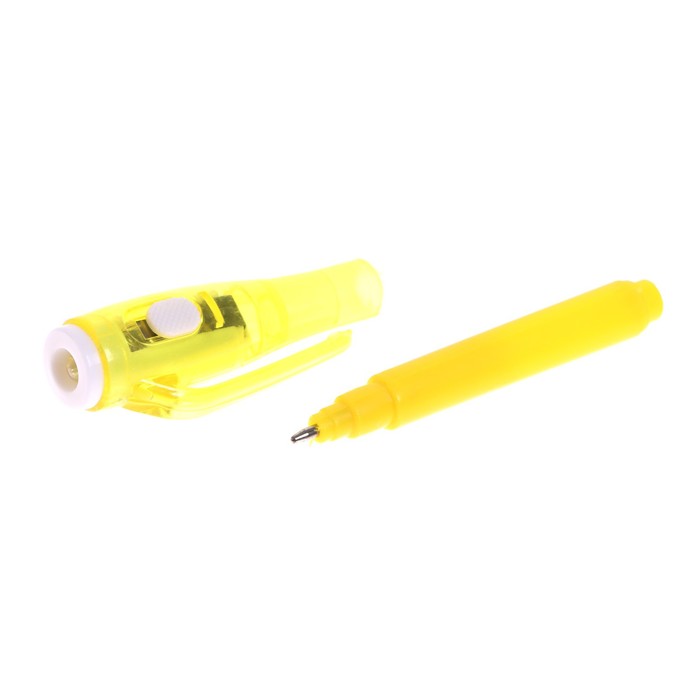 У волшебной ручки есть ещё одна функция — невидимые чернила. Снимите колпачок и напишите что-нибудь на листе бумаги, а затем посветите на надпись фонариком. Рисунок проявится.