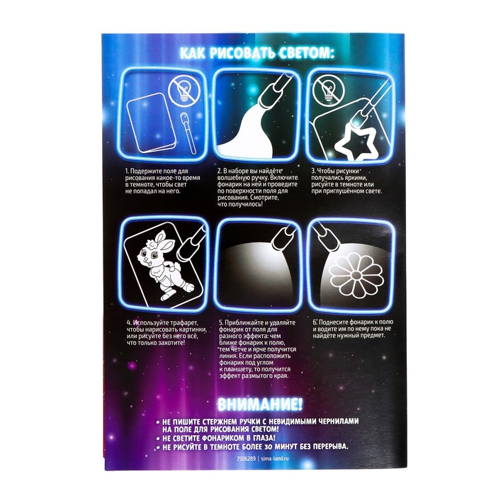 С помощью набора для рисования светом ребёнок освоит новый вид творчества. Всё, что пригодится для этого, уже есть в комплекте: поле для рисования, трафареты, специальная ручка и фонарик.