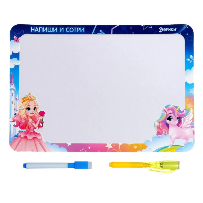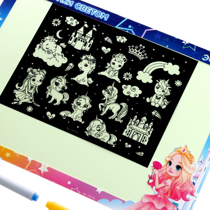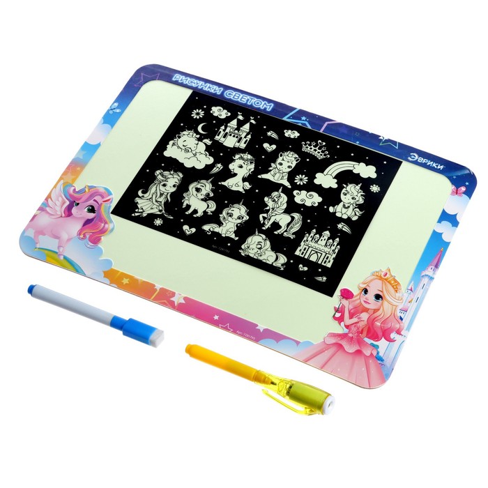 Если со стороной «Напиши и сотри» для рисования обычным маркером всё ясно, то на стороне для рисования светом ребёнок создаст яркие рисунки в необычной технике.