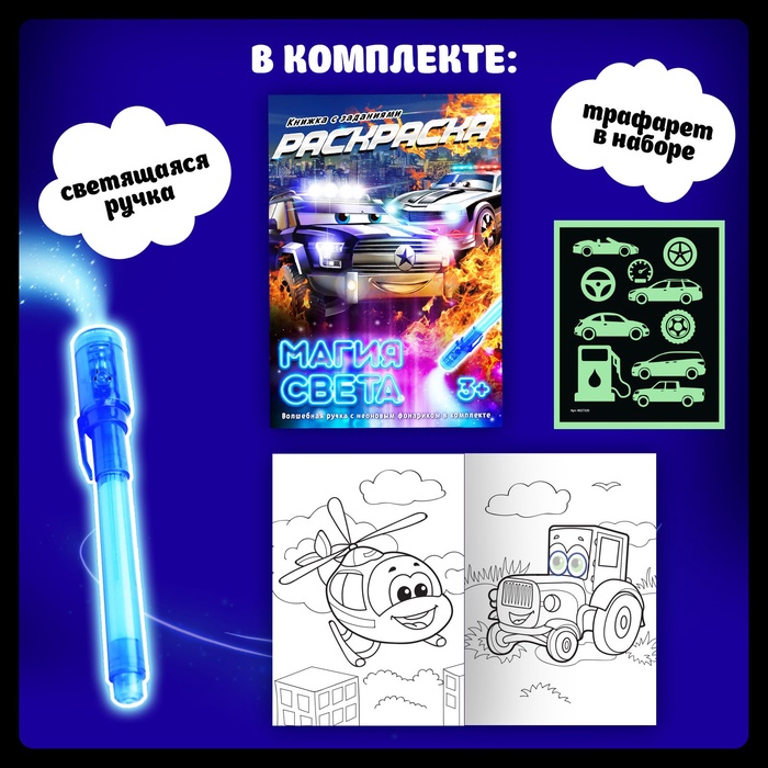 Набор для рисования светом «Тачки», с наклейками и раскраской, ручка с фонариком и невидимыми чернилами — Характеристики