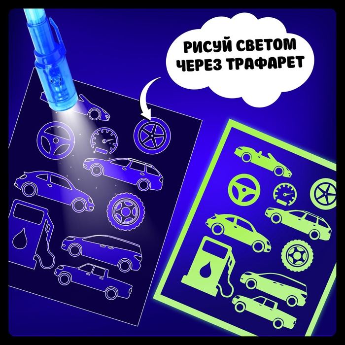 Набор для рисования светом «Тачки», с наклейками и раскраской, ручка с фонариком и невидимыми чернилами