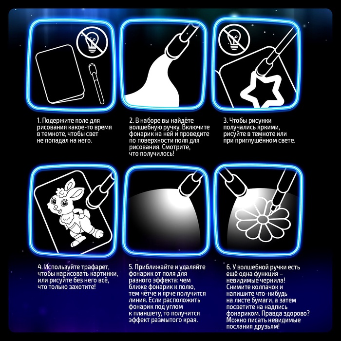 Чтобы изображение получалось яркими, рисуйте световым маркером в темноте или при приглушённом свете.