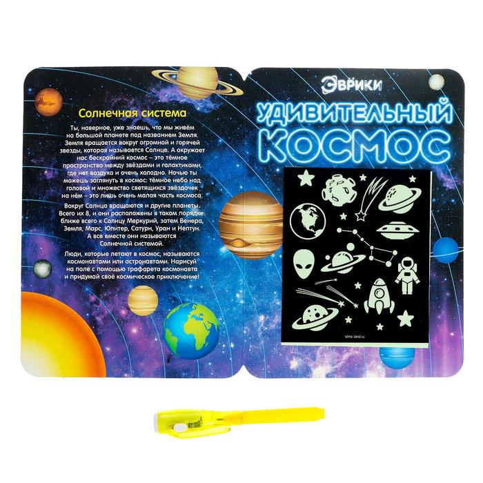 Набор для рисования светом «Удивительный космос» — это творческая игра, которая превращает тёмную поверхность в волшебное полотно. Используя специальную ручку с фонариком, ребёнок сможет создавать светящиеся рисунки, которые постепенно исчезают, освобождая место для новых шедевров.