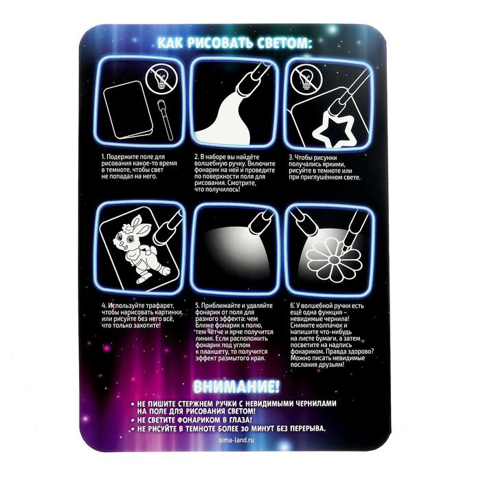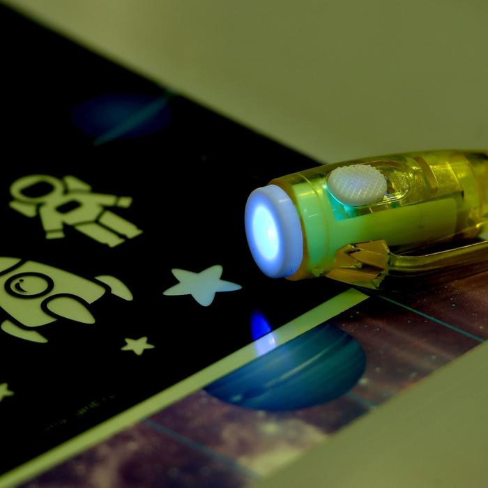 Световой маркер оставляет след на поле, создавая яркие линии, которые исчезают через несколько минут. Чем темнее в комнате, тем эффектнее выглядит рисунок. Дополнительные трафареты помогут детям изобразить планеты, звёзды, ракеты и другие элементы космоса.