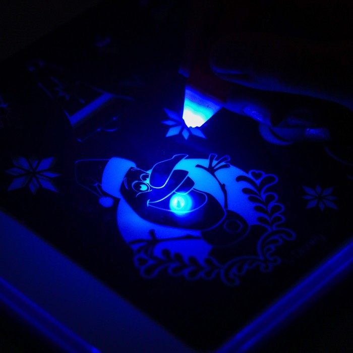 С помощью такой доски кроха сможет опробовать рисование светом. Для этого поместите планшет в тёмное место, удерживайте кнопку на маркере и ведите по поверхности. Ребёнок может использовать трафарет или придумать собственные сюжеты. Чем ближе вы держите маркер к планшету, тем ярче будет изображение.