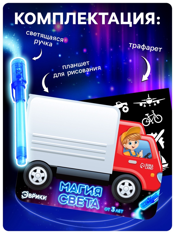 Набор для рисования в темноте «Транспорт», А5, ручка с фонариком и невидимыми чернилами — Характеристики