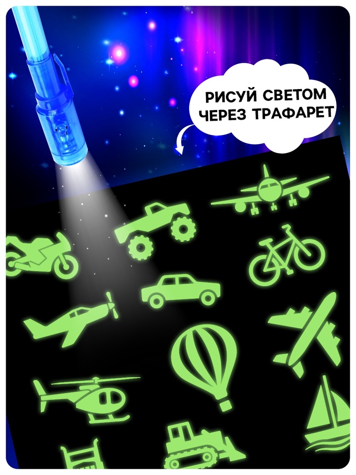Набор для рисования светом «Транспорт» — это отличная возможность развить творческие способности и фантазию ребёнка! С помощью специальной ручки малыш научится рисовать светом, будет создавать картинки, используя трафареты, или придумает собственные сюжеты.