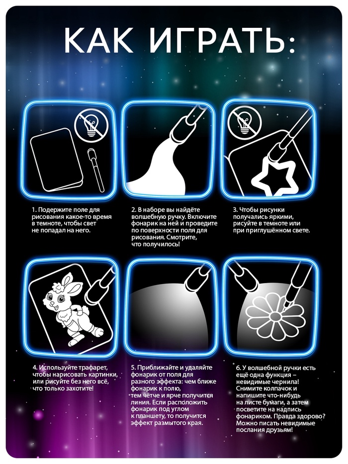- Включите фонарик на волшебной ручке и проведите им по поверхности поля для рисования. Чтобы рисунки получались яркими, рисуйте в темноте или при приглушённом свете.