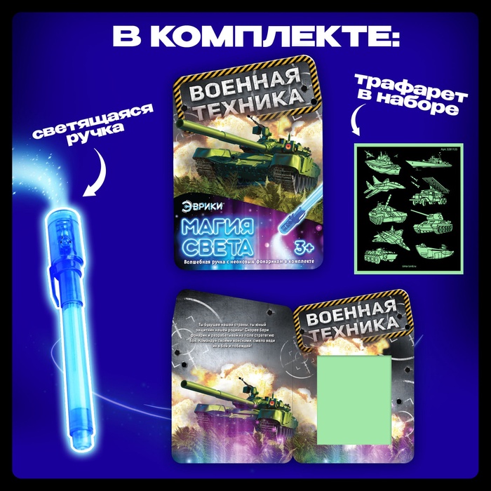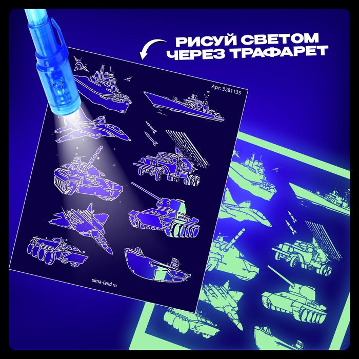 Набор для творчества в темноте «Военная техника» — это захватывающая игра, которая позволит ребёнку создавать яркие рисунки, видимые только в темноте. В комплекте есть специальный маркер с невидимыми чернилами и фонарик, которым можно «проявлять» изображения. Такой формат рисования открывает безграничные возможности для фантазии и превращает процесс в увлекательный эксперимент.