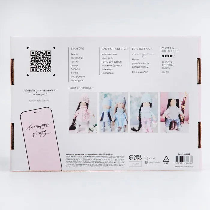 размер готовой игрушки около 30 смготовое изделие станет стильным украшением для вашего доманабор упакован в красивую коробку, он может стать отличным подарком для ребенка и взрослоговы сможете собрать целую коллекцию кукол и игрушек АРТ Узор Чем полезно?