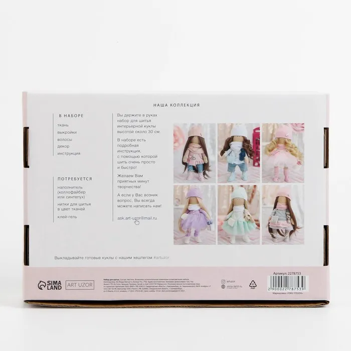 размер готовой игрушки около 30 смготовое изделие станет стильным украшением для вашего доманабор упакован в красивую коробку, он может стать отличным подарком для ребенка и взрослоговы сможете собрать целую коллекцию кукол и игрушек АРТ УзорЧем полезно?