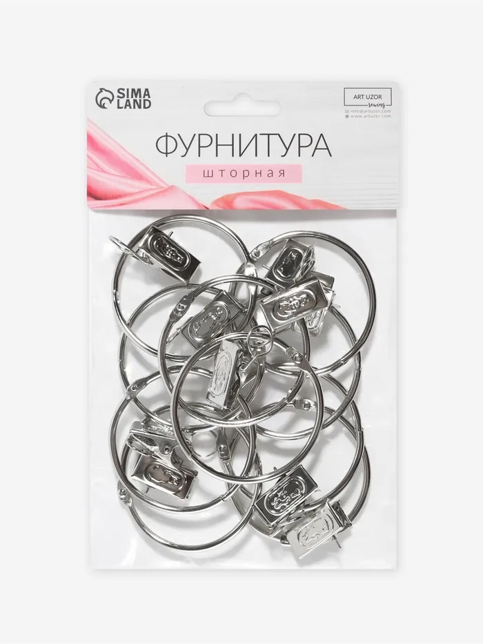 Набор для штор, кольцо разъёмное, d=52/58 мм, 10 шт., зажим, 33×11 мм, 10 шт., цвет серебряный — Характеристики