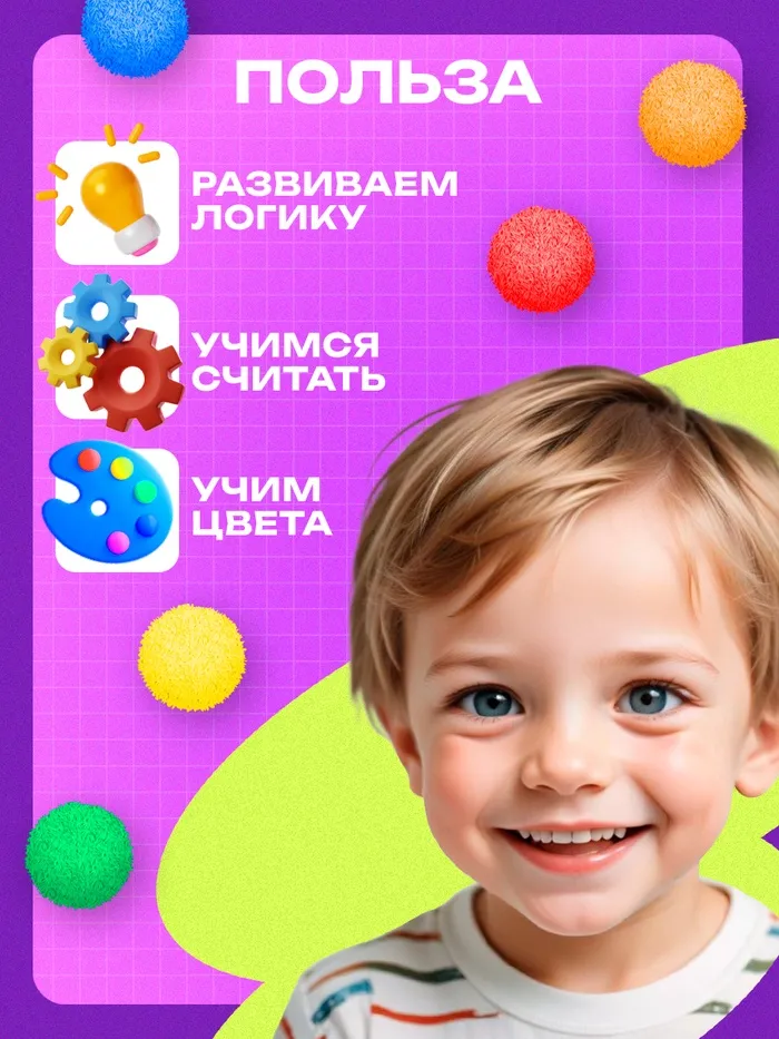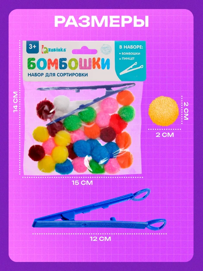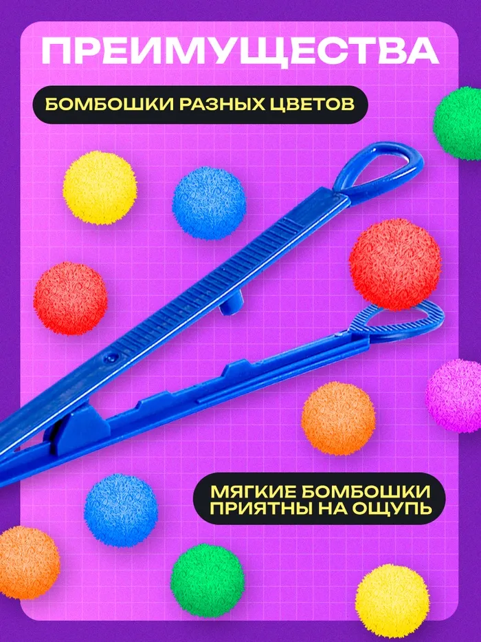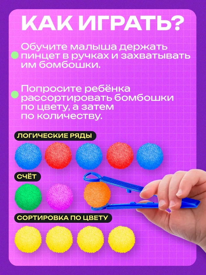 В комплект входят яркие шарики-бомбошки и пинцет для сортировки.