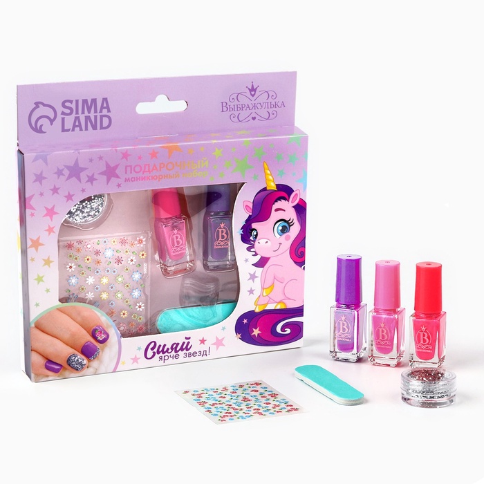 Маникюрный набор для девочек «Сияй ярче звезд» 6 в 1 – это все для маникюра юной модницы в одном наборе! Он состоит из набора лаков для ногтей (3 шт.), микса наклеек для ногтей, блесток и пилочки.