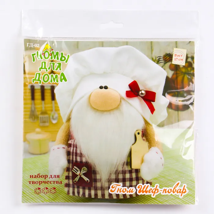 С набором для шитья у вас получится своими руками создать мягкую игрушку в виде гнома шеф-повара, который прекрасно дополнит интерьер вашей кухни. Внутри набора вы найдёте необходимые материалы и инструкцию, в которой подробно написано, как сделать игрушку.