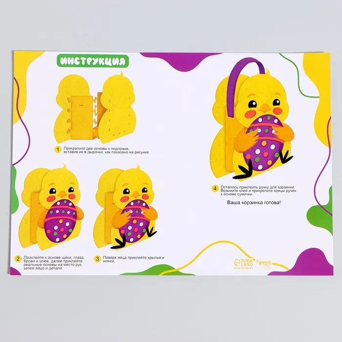 Детям нравится создавать поделки из самых невероятных материалов. Оригинальный набор для создания фетровой корзиночки по-настоящему увлечёт ребёнка и станет удачным подарком для талантливого малыша! Теперь вам не нужно вырезать детали вручную, просто отделите защитную пленку и приклейте их на нужное место.