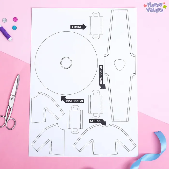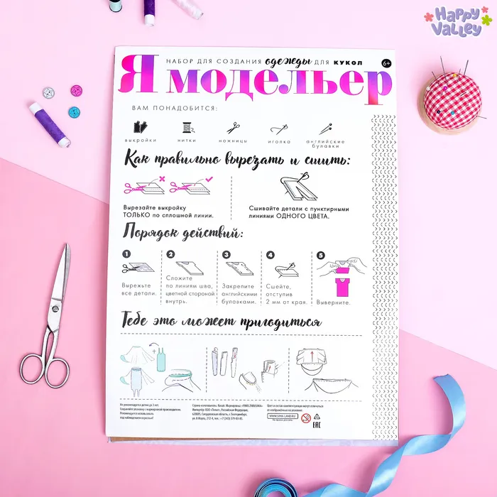 В набор входят лекала будущей одежды, ткань и инструкция с основами швейного мастерства.