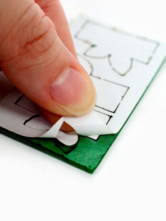 - После того как вышивка завершена, приклейте декоративные элементы. Все детали уже имеют клеевую основу — просто снимите защитную плёнку и аккуратно прижмите элемент к сумке в нужном месте.