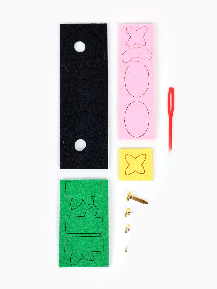 - Достаньте все элементы из упаковки и разложите их на ровной поверхности. Основа сумки уже имеет специальные отверстия для вышивания — ничего дополнительно прокалывать не нужно.