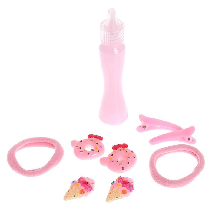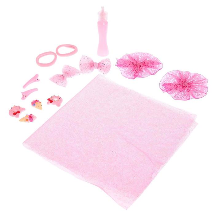 В комплекте есть всё необходимое для этого: основы для заколок, резинки для волос, бантики и фигурки для украшения, фатин для резинки.