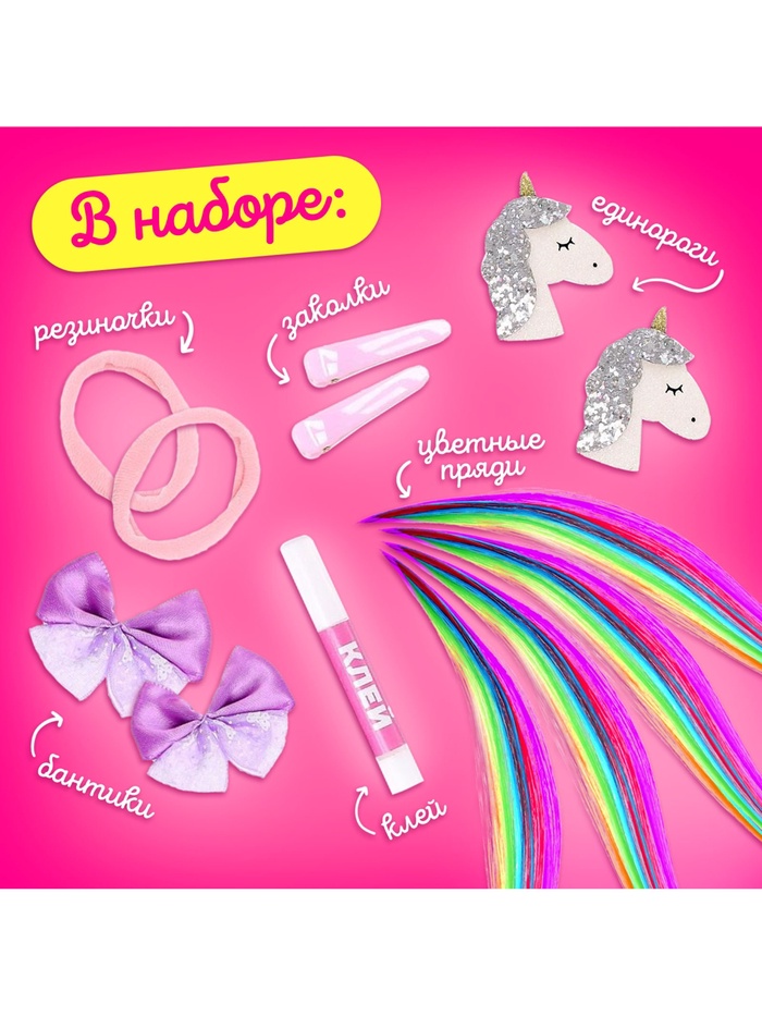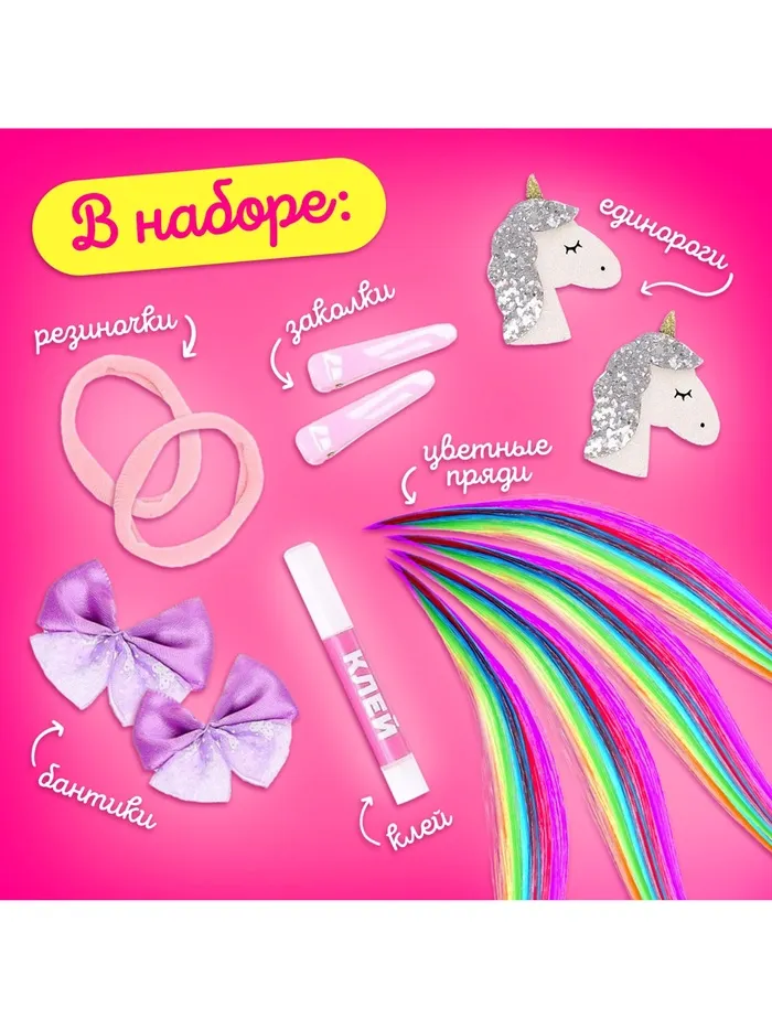В комплекте есть всё необходимое для этого: основы для заколок, резинки для волос, декор, цветные прядки.