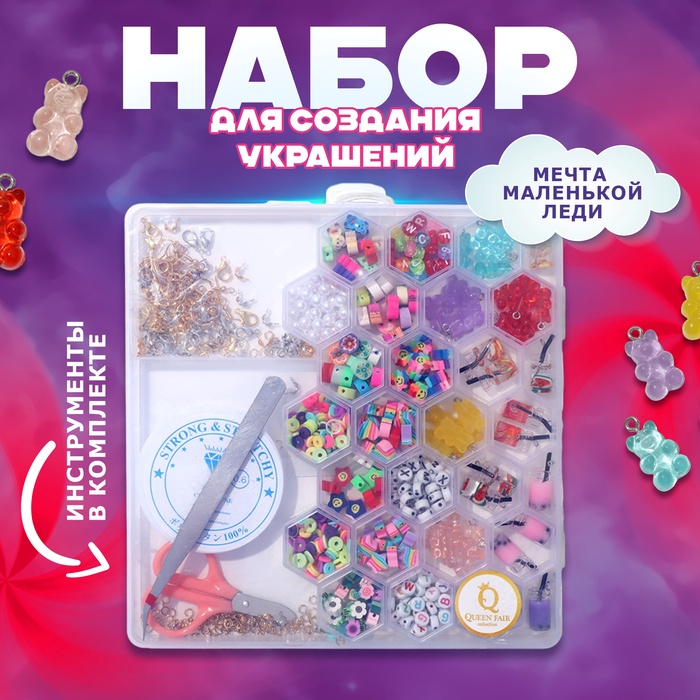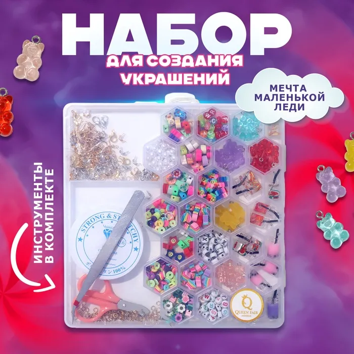 Набор для создания украшений открывает безграничные возможности для творчества и самовыражения. В комплекте представлены 24 вида разноцветных бусин из пластика, металла, стекла, акрила и полимерной глины, а также разнообразная фурнитура, которая позволит воплотить в жизнь любые дизайнерские задумки.