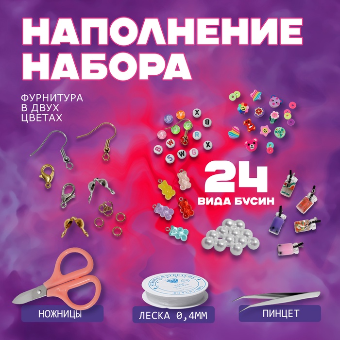 Набор для создания украшений «Краски», 24 вида бусин, фурнитура, ножницы, леска 0,6 мм — Характеристики