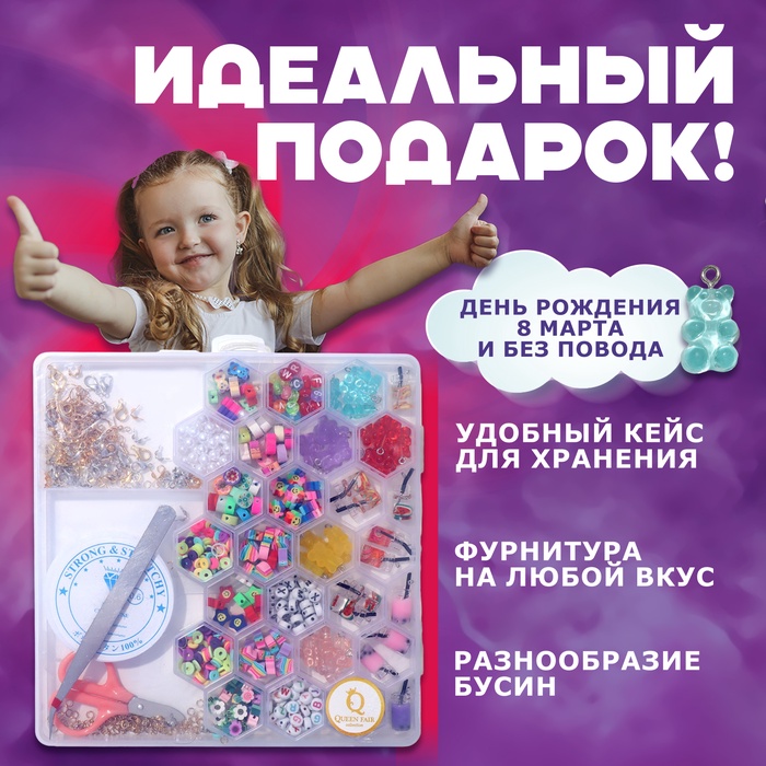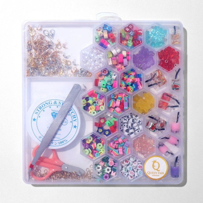 Набор для создания украшений открывает безграничные возможности для творчества и самовыражения. В комплекте представлены 24 вида разноцветных бусин из пластика, металла, стекла, акрила и полимерной глины, а также разнообразная фурнитура, которая позволит воплотить в жизнь любые дизайнерские задумки.