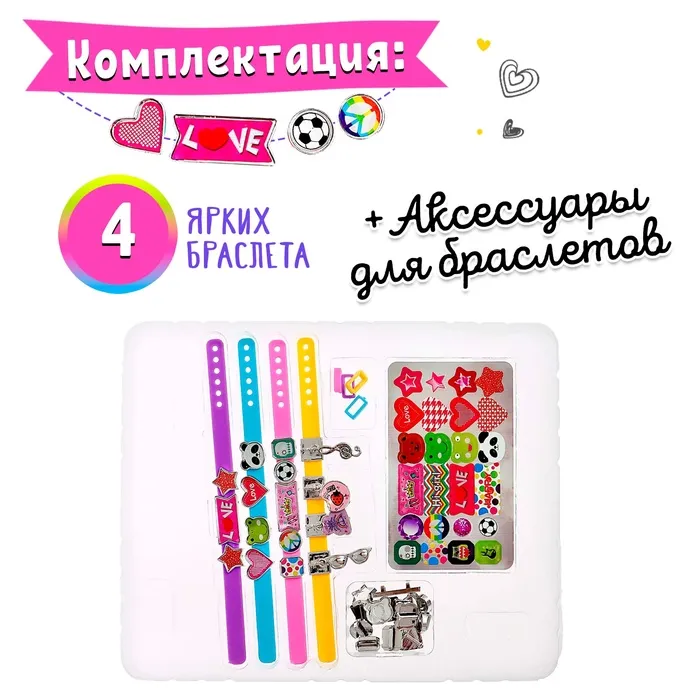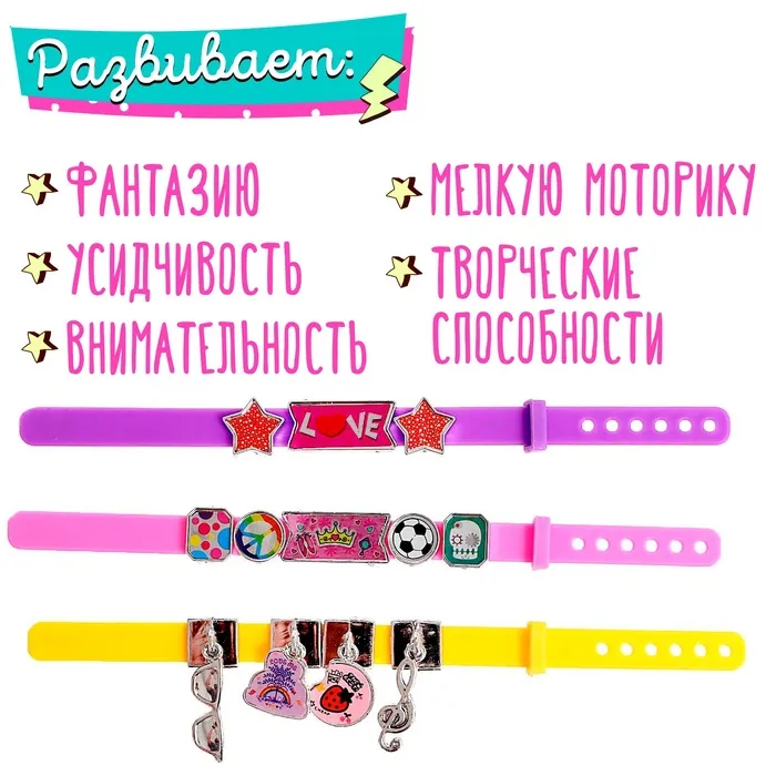 В наборе есть всё необходимое для творчества: 4 заготовки и аксессуары для браслетов, из которых можно делать украшения в разных стилях.
