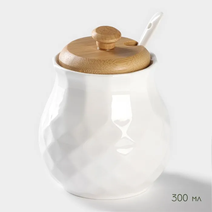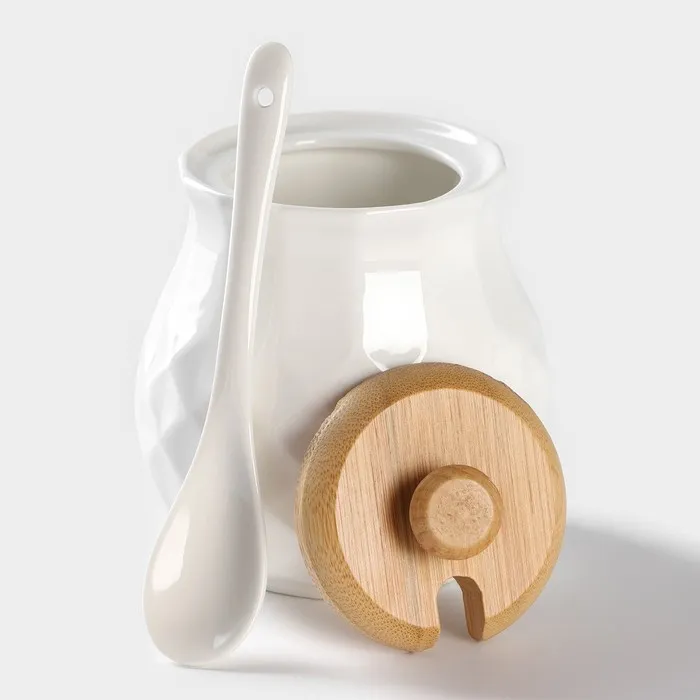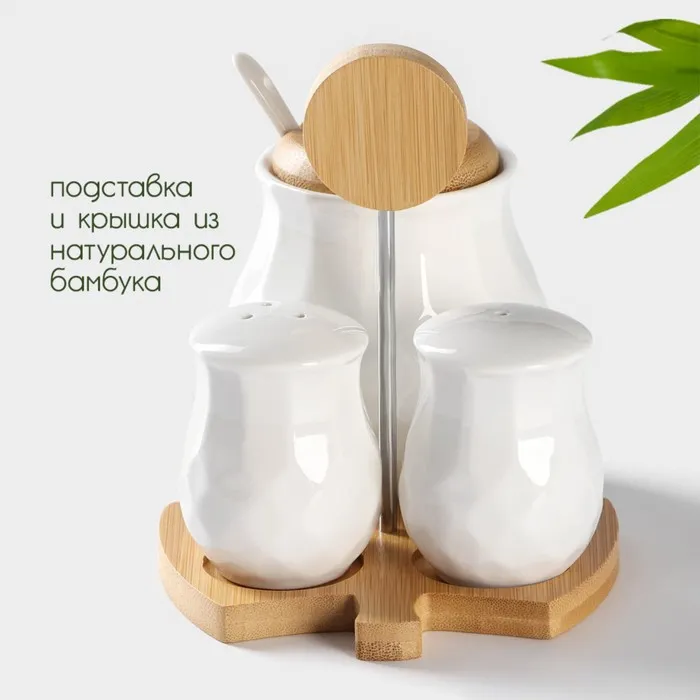 Набор для специй BellaTenero, 3 предмета: солонка 150 мл, перечница 150 мл, сахарница с ложкой 300 мл, на бамбуковой подставке, фарфор, белый — Характеристики