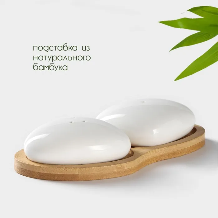Набор для специй BellaTenero, 3 предмета: солонка 40 мл, перечница 40 мл, подставка, на бамбуковой подставке, фарфор, белый — Характеристики